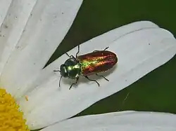 Anthaxia thalassophila can reach a length of 4–6 millimetres (0.16–0.24 in).[2] This species is characterized by the brilliance of its colors: bright green and dark red with metallic reflections in the females, while the males in place of the red present a bright yellow color with a reddish sheen.