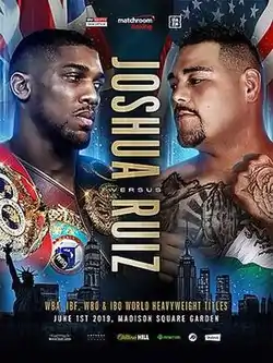 Anthony Joshua vs. Andy Ruiz Jr. was a heavyweight professional boxing match contested between undefeated and unified WBA (Super), IBF, WBO, and IBO champion Anthony Joshua, and former world title challenger Andy Ruiz Jr. The bout took place on June 1, 2019, at Madison Square Garden in New York City, New York. Joshua was originally scheduled to face undefeated WBA No. 2 and WBO No. 3 ranked heavyweight Jarrell Miller, who was replaced by Ruiz Jr. after Miller failed three drug tests.[1]