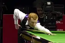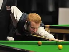 McGill finished the year by qualifying for the televised stages of the World Championship for the first time, after coming through three matches, ending with a 10–9 victory over Mark King which he closed with a 127 break.[18] Compatriot Stephen Maguire levelled their first round match at 9–9 after having been 9–5 behind, but McGill once again made a century break in the deciding frame, this time a 122.[22] McGill then knocked out defending champion Mark Selby 13–9 in the second round, with Selby stating that he believed McGill could win the title if he could maintain his form.[23] In the third ranking event quarter-final of his career, McGill lost 13–8 to Shaun Murphy.[24] The crowd warmed to McGill during his run in the tournament due to him smiling frequently between shots and displaying a relaxed attitude.[25][26] He was the world number 24 afterwards, resulting in a climb of 21 places in 12 months.[27]