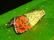 The wingspan is about 13 mm. The basal half of the forewings is yellow, irrorated (sprinkled) with blackish and with a dark-fuscous line. Beyond this, the ground colour is dull purple, with dark-fuscous markings edged with red, except for four yellowish costal dots. The hindwings are dark fuscous, partly suffused with pale reddish.[2]