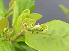 The taxa can grow as a shrub or a small tree, from 2m up to 20m high,[4] in Australia often with a short, poorly-formed trunk/bole.[5] Dark-coloured bark. Leaves are some 3-7 by 3–5 cm in size (sometimes as short as 2 cm or as long as 16 cm, as narrow as 2 cm and as wide as 9 cm), with curving lateral veins (but these do not form distinct loops inside the margin), oblong blade (occasionally ovate or obovate); pale twig lenticels; pubescent, filiform stipules; tufts of hair/domatia present; leaves dry to olive-green to reddish-green. Its flowers emerge at the axils or on the tip of branches. Male flowers have 4–5 stamens with u-shaped anthers, while female flowers have ovaries covered with soft hairs.[6] Yellow-green flowers,[7] some 1mm in diameter with pubescent disc, these are for both male and female flowers. Small fruit, only 4-5mm long with a persistent calyx that is not disc-like. Seed germination occurs in 28–9 days. There are elliptic cotyledons, some 8 by 5mm. At tenth leaf stage there are hairy petioles and hairy, filiform stipules (1-2mm long). In Western Australia, flowering occurs from August to December.[7] In Thailand, flowering and fruiting is all year round.[8] In Zhōngguó/China, flowering is from March to September, while fruiting is from June to December.