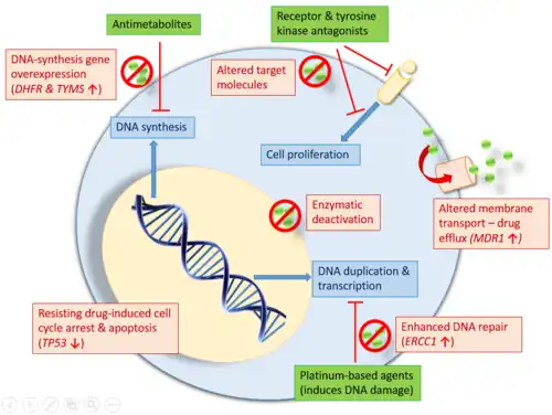 Cancer cells can become resistant to multiple drugs by altered membrane transport, enhanced DNA repair, apoptotic pathway defects, alteration of target molecules, protein and pathway mechanisms, such as enzymatic deactivation.[12]