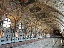 The ground floor hall of the Antiquarium, 69 metres long, is considered the largest Renaissance hall north of the Alps. The continuous barrel vault is hollowed out by the piercing caps of the 17 pairs of windows and is transparent.[2] The rich painting by artists such as Hans Donauer the Elder, Alessandro Scalzi, called Padovano, Peter Candid and Antonio Viviani with 102 views of old Bavarian towns was completed only at around 1600.[1]