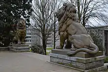 Bouré's reputation rests primarily on his large sculptural lions, characterized by their athletic musculature and majestic air.[20] The most famous of these is the colossal lion that sits atop the Gileppe Dam "like a cat on a garden wall."[21] The Gileppe lion stands 13.5 meters tall (around 44 feet).[22] Weighing 130 tonnes, it was constructed from 183 blocks of sandstone brought to the site by horse-drawn carts.[23]