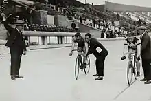 ![]() Antoine Mazairac (left) at the 1928 Olympic Games in Amsterdam in the sprint semi-final against the Danes Willy Falck Hansen. | |||||||||||||||