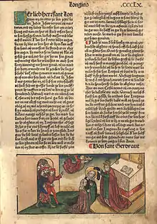 Of Koberger's many different printed editions which he produced from the late 15th century to the early 16th century, three stand out in particular. He printed an illustrated edition of the Bible in High German in 1483, complete with many remarkable woodcut illustrations. The text is from the first German Bible printed by Günther Zainer in the 1470s. Despite popular misconception, Martin Luther's celebrated translation of the Bible into Low German, i.e. Vernacular German, in the early 16th century was not the first German Bible, the Zainer edition appearing nearly 50 years before Luther's, and Koberger's editions of the same translation shortly thereafter. (Legend holds that Luther had approached initially Koberger's printing house to produce his translation of the Bible into German but the printing house declined the project. Scholars have speculated that the Koberger printing house might have continued well beyond 1526 had they accepted the project.) Koberger also printed an edition of the Golden Legend by Jacobus de Voragine in German in 1488, also illustrated with woodcuts of saints and religious themes.[7] His most celebrated project is the so-called Nuremberg Chronicle of 1492, or Liber Chronicarum, probably the most extensively illustrated edition of the incunabula period, c. 1450–1500. Editions were produced in both Latin and German. The work was so popular, it is believed by scholars to have had one of the largest print-runs of the Incunabula Period. Because of the popularity, pirated editions appeared almost immediately after Koberger's edition.[8]