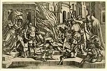 The enterprise seems to have been "just slightly premature" in terms of catching a market.[29] The etched prints were often marked by signs of the workshop's inexperience and sometimes incompetence with the technique of etching, and according to Sue Welsh Reed: "Few impressions survive from these plates, and it is questionable whether many were pulled. The plates were often poorly executed and not well printed; they were often scratched or not well polished and did not wipe clean. Some may have been made of metals soft as copper, such as pewter."[30] A broadening market for prints preferred the "highly finished textures" of Nicolas Beatrizet, and later "proficient but ultimately uninspired" engravers such as René Boyvin and Pierre Milan.[31]