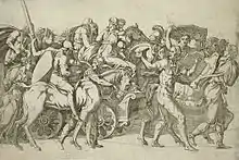 The Continence of Scipio: Scipio, in Roman armour, giving the woman back to her husband kneeling on the left. 1543 Etching after Giulio Romano
