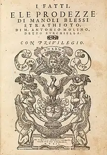 In 1561, Molino published a lengthy comic poem in eight cantos, I fatti e le prodezze di Manoli Blessi strathioto, dedicated to Giacomo Contarini. Written in Venetian with some greghesco, it is about the fiction Greek soldier Manoli Blessi.[3] In 1564, musical settings of his poetry in greghesco were published in Il primo libro delle greghesche, with contributions from Gabrieli, Merulo, Rore, Willaert and Annibale Padovano.[5]