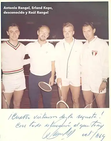 Antonio Rangel was part of the first Mexican team that competed in the Thomas Cup (American zone) and that was defeated by Japan in February 1964 (0-9).[1][9] In February 1967, he competed for the second time with the Mexican team that was eliminated by Canada in the semi-finals of the zone; Antonio Rangel lost against the Canadian champion, Wayne Macdonnell: 12-15, 15-6 y 15-8.[10] In men's doubles, he played together with Oscar Luján, against the brothers Ed and Rolf Paterson and lost: 15-5 y 15-6.[10] In 1970, Antonio Rangel participated in the Thomas Cup for the last time as member of the team that was coached by the former Indonesian player Tan Joe Hok (winner of the All England in 1959), this time Mexico lost against the United States (2-7), in San Diego, California.