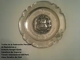 Trophy awarded by the Peruvian Federation of Badminton to Antonio Rangel Ojeda for winning the International Tournament of Peru in 1966 - 1963 - Lost the singles final of the III University of Texas Open, also known as the Texas Open, against Tan Joe Hok.[3][4]