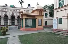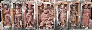 The period when the temple was built was curious. Muslim rule was ebbing out and the Europeans were making forays into the country. It is said that Krishna Ram Mitra built the temple to enthuse the Hindus. Terracota work which was earlier an exclusive preserve of Bishnupur artisans was no more so. While Radha and Krishna are predominant in the carvings, there also is the goddess Durga, whose worship had been revived in a big way by Nabakrishna Deb of Shovabazar Rajbari in 1757.[2][3]