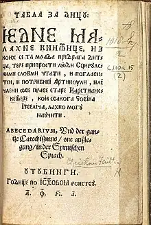 ![]() The first page of 1561 Cyrillic work "Tabla za Dicu", a translation of Primož Trubar's "Primer" by Antun Dalmatin | |