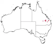 Apatophyllum teretifolium is currently known from the following reserves: Expedition National Park, Barakula State Forest near Chinchilla, Lonesome National Park, Nour Nour National Park and the Moolayember Section of Carnarvon National Park. Apatophyllum teretifolium is also known from several private properties[2].