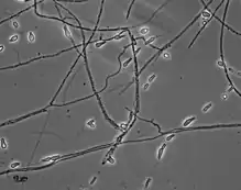 The cuticle is the first region of the hair that is attacked in an A. fulvescens infection.[10][11] This attack resembles that of true dermatophytes in that some lateral hyphae give rise to fronded mycelium. However, some hyphae also give rise to appressoria, or flattened hyphal pressing organs, which are characteristic of non-keratinophilic fungi. Dermatophytes digest the hair cuticle rapidly, unlike A. fulvescens, which breaks the cuticle down so slowly that the scales are still visible for weeks after the hair has been infected.[10]