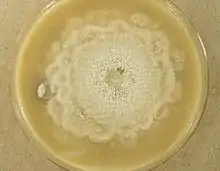The colonies of Aphanoascus fulvescens at 30 °C (86 °F) on glucose-peptone agar have a flat topology and a powdery to felt-like texture and are usually white to cream coloured depending on the number of brown ascomata present on the surface. Under the microscope, A. fulvescens is seen to have numerous, large club-shaped conidia with older colonies containing fruiting bodies, or ascomata, at their centres. These fruiting bodies are relatively large, ranging from 290–500 μm in diameter, and are either colourless or have a light brown pigment.[5] The presence of the ascomata is characteristic of all members of the Ascomycota. The ascomata are smooth and have thick, enclosed walls lacking any openings. They reach full maturity after 8–10 days of colonial growth at optimal temperatures and eventually burst to release the asci contained within them. The asci have walls composed of two to four layers of flattened cells which in total amount to 4–6 μm in thickness. There are eight ascospores contained within each ascus in A. fulvescens colonies. The ellipsoidal ascospores are a light brown colour and are either lens shaped or disc shaped. They can be as large as 5 x 3.5 μm and have notably rough walls. The ascospores of A. fulvescens are different than those of other members of the Amauroascaeae which have ascospores that are usually globular and round. Rather, the unicellular ascospores of A. fulvescens are found to be flattened with reticulate walls. The hyphae of A. fulvescens are hyaline, branched, and contain many cross-walls (setpa). They are generally 1.7–3 μm wide and are contained within thin walls.[1]