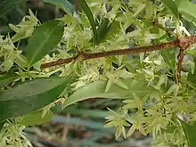 Usually a vine or small shrub growing in moist areas. Leaves 4 to 8 cm long, 1.5 to 3 cm wide, wavy edged or toothed. Leaf stem 2 to 5 mm long. The stems hairless, marked with lenticels. Four petal flowers form on cymes, petals 1 to 3 mm long. The fruit is a nut, 2 to 3 mm long.[3]