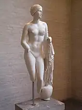 The Aphrodite of Knidos was a marble carving of the goddess Aphrodite by the sculptor Praxiteles, which was bought by the people of Knidos in the middle of the 4th century BC.[1] The earliest text to mention the Aphrodite is Pliny the Elder's Natural History,[2] which reports that Praxiteles carved two sculptures of Aphrodite, one clothed and one nude; the clothed one was bought by the people of Kos and the Knidians bought the nude one.[3] The statue was set up as the cult statue for the Temple of Aphrodite at Knidos. It depicted the goddess Aphrodite as she prepared for the ritual bath that restored her purity, discarding her drapery with one hand, while modestly shielding herself with the other. The placement of her hands obscures her pubic area, while simultaneously drawing attention to her exposed upper body. The statue is famed for its beauty, and is designed to be appreciated from every angle.