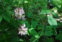 The vines may be up to 3 to 5 meters (10 to 16+1⁄2 feet) long. It has a large underground tuber, distinguishing it from other Apios species. The leaves are alternately arranged on the stem, about 20–30 centimetres (8–12 inches) long, and comprising seven leaflets. The fragrant pale pink or greenish-yellow pea-like flowers bloom in the summer.[2] The fruit is a long slender pod about 10 to 15 cm (4 to 6 in) long.