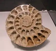 Ammonites (Apoderoceras) were predatory mollusks that resembled a squid with a shell. These cephalopods had eyes, tentacles, and spiral shells. They are more closely related to a living octopus, though the shells resemble that of a nautilus. True ammonites appeared in the fossil record about 240 million years ago. The last lineages disappeared 65 million years ago at the end of the Cretaceous.[3]
