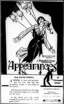 Appearances is a 1921 British drama film directed by Donald Crisp. Alfred Hitchcock is credited as a title designer. It is a lost film.[1]