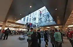 The cube was designed to motivate people to enter the store, creating a "ceremony of descent", a grand entrance to ennoble visitors rather than put people off entering the basement store.[5] The glass cube was inspired by and likened to the Louvre Pyramid in a 2005 New York Times article; the skyscraper's owner had solicited ideas from the pyramid's architect, I. M. Pei.[6] The glass cube features 15 large panels of glass, unchanged during the 2017–19 renovation. A 2011 renovation streamlined the design from the original 90 panels that made up the structure,[7] and made the glass panels fit together seamlessly.[8]