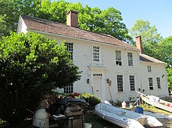 Built around 1826 by Russel Gallup, the two-and-a-half-story Applewood Farm's farmhouse design harkens back to the earlier colonial center chimney design with Federal style details. [2] The National Register of Historic Places nomination form states that the house's construction may have been influenced by an earlier house built on the opposite side of Colonel Ledyard Highway, but there is no evidence for that design, but notes that it was a retardetaire example. The farmhouse is 36 feet (11 m) feet long and 28 feet (8.5 m). Around 1842 a 20 feet (6.1 m) by 16 feet (4.9 m) one-and-a-half-story wing was added to the east side.[2] The rear ell, a one-and-half-story structure measuring 20 feet (6.1 m) by 14 feet (4.3 m), connects to a 60 feet (18 m) by 15 feet (4.6 m) shed.[2] The house and its additions are all topped with gable roofs and were using wooden shingles at the time of its historic nomination in 1987.[2] The farmhouse has six fireplaces, with those on the first floor are made of cut granite blocks also with granite hearthstones and the second floor are made of brick with granite lintels with brick hearths.[2][5] The house has had modernization throughout the years, including modernizing the kitchen and bathrooms that has not significantly altered the floor plan.[2] The hardware in the house was modernized and updated over the years, but had reproduction colonial hardware and early 20th-century hardware at the time of its nomination.[2] Some changes, like the installation of a new door in 1986 were done specifically to meet fire code regulations.[2]