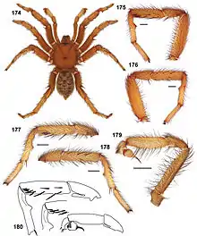 Females differ from the males in that their carapace, legs, and chelicerae tend to be a red-brown color and their abdomen has a mottled chevron pattern. Females tend to be larger, their cephalothorax's carapace is 8 centimetres (3.1 in) long and 6.88 centimetres (2.71 in) wide. Their cephalothorax is covered with both black and white intermingled setae but the outside edges lack setae. Their chelicerae are comprised of eight teeth and the palpal endites have twelve cuspules. The rastellium has 7 short spines all in a row that extend out and upwards. The female's anterior legs are more slender than their posterior pair. Their spermathecal bulbs form a long, curved stalk.[2]