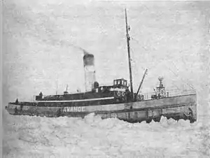 The ship was powered by a 1,500 ihp triple-expansion steam engine driving a single propeller in the stern and giving Avance a maximum speed of 13.5 knots (25.0 km/h; 15.5 mph) in open water. She had two coal-fired boilers and a smaller auxiliary boiler, all in a single engine room amidships. Her stores could hold 100 tons of coal, which was fed to the boilers at a rate of 1.3 to 1.8 tons per hour when the ship was breaking ice.[10] Like other icebreakers of her time, she was also equipped with sails which, while rarely used, remained in the inventory until the 1920s.[4]
