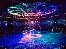 Since partnering with Epson and Maxell, aquariums have incorporated projection mapping into entrance hall and dolphin shows.[17] The Stadium has 1,350 seats, and there are shows by Pacific white-sided dolphins, bottlenose dolphins, and false killer whales that make full use of technology such as water curtains. [18][19] Also, the dolphin show at The Stadium is different day and night.[20]