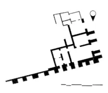 The well-preserved monumental buildings of the so-called Baths of Vespasian lie about 2 km west of lake Cutilia and extend for 400 m and on four terraces. The site was probably originally a sanctuary to the goddess Vacuna similar to many others built in Latium in the late Republican age. On the 2nd terrace, a large natatio (swimming pool) was excavated from the solid rock, measuring 60 by 24 m, and was accessed by swimmers by steps on the longer sides of the basin.[12] It was extended in several periods and used up to the 4th c. AD, and was probably fed by an underground spring. There is also a series of niches and rooms around an apse on the north side that formed a monumental nymphaeum. The west side lies beneath a later church and mill and dates to the Flavian era, showing rooms that heated the spring water for the baths. The baths were used until th 4th-5th century.