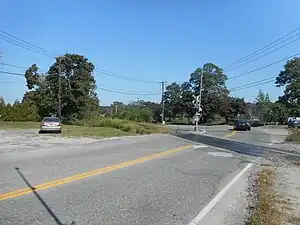 Aquebogue first appeared on the June 1892 timetable.[1] Work began in March 1910 and was completed over the summer. An acre of land on the east was bought and filled in to provide a 1400-foot passing track. A new frame station was built in 1911 on the south side of the track opposite the new station.[2] A new depot was erected at Aquebogue in 1910, and was gutted out and remodeled as a shelter shed in 1956, and was finally razed in July 1967.