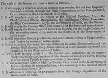According to a Committee of Imperial Defence paper from 7 January 1916, the Arab Bureau was established to "harmonise British political activity in the Near East...[and] keep the Foreign Office, the India Office, the Committee of Defence, the War Office, the Admiralty, and Government of India simultaneously informed of the general tendency of Germano-Turkish Policy."[2]