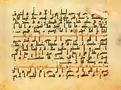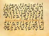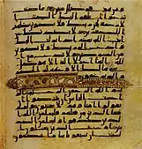 Written in the territory of modern Iraq in the Kufic script. Now kept in the Hast Imam library, in Tashkent, Uzbekistan.[42][43] Its verse endings are marked by small panels of diagonals lines; the tenth verse is marked with a square medallion illuminated in blue, green, red and manganese with a stellar design.[44]