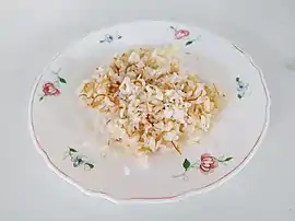 The vermicelli used is the finest variety of noodles, called şehriye in Turkey, or shariyah (شعرية) in Arab countries, pastina or cappellini in Italy, and cabello de angel in Spain. They are a finer variety than spaghetti. As a fat agent, clarified butter is usually used, called in Arabic samneh (سمنة), better known internationally as ghee.[2][3] Failing that, ordinary butter or olive oil can be used.[2] A multitude of ingredients of all kinds can be added to the basic recipe, depending on each region, and even on each home: raisins and pine nuts,[4] garlic or onion, almonds, etc.