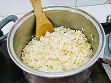 Arabic rice or rice with vermicelli (in Classical Arabic: ٱلْأَرُزُّ بِٱلشُّعَيْرِيَّةِ; Al-Aruzz bi-sh-shu'ayriyyat, in Lebanese Arabic: Rizz bi-sh-shʿayriyyeh "rice with vermicelli"; in Turkish, şehriyeli pirinç pilavı) is a traditional preparation of rice in the Middle East, a variant of the simpler cooked rice recipe, but adding lightly toasted vermicelli (tiny noodles). The rice cooking method is known as pilaf,[1] by which the rice is fluffy, light and does not stick. Traditionally, a long-grain rice, such as basmati or jasmine, is used,[1] although short-grain rice, such as bomba or misri ("Egyptian"), can be used perfectly. Brown rice can also be used.[2]
