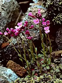 This is a perennial herb growing one or more slender stems from a small, branching caudex, reaching 10 to 30 centimeters tall. There is a basal patch of leaves with edges lined in small, widely spaced teeth which are sometimes tipped with spines. The leaves may lack teeth and have wavy margins. There may also be a few smaller leaves along the stem. The top of the stem forms an inflorescence of a few flowers, each with four bright rose-purple petals. The fruit is a flat, straight silique about 3 centimeters long which contains several oblong little seeds.