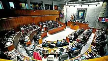 The modern Cortes were established in 1983 under Article 12 of the Statute of Autonomy for Aragon.[3] This statute also sets out the functions of the Aragonese assembly in Article 16 and these include the election of the President of Aragon, approving the actions and legislation of the President, creating legislation, amending the Constitution of Aragon and supervising any relevant planning or economic projects. It must monitor borrowing and spending and appoint an Auditor General for Aragon. Additionally the legislature must elect the appropriate number of Senators to serve in the Spanish Senate.[3]