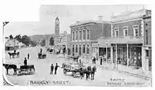 Upper Barkly Street in 1894. The fire brigade tower (since demolished) is the tall building in the distance, E.S. & A Bank and drapery business is on the right