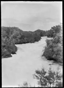 Before construction of the dam and hydro station, the Aratiatia Rapids were a prominent feature on the Waikato River; a scenic reserve from 1906.[4] The dam construction meant that no water flowed over the rapids. However, several times a day, the Aratiatia dam gates of the Waikato River are opened, which restores the rapids to their normal operation. There are several public lookout points on the high rock bluffs that dominate this turbulent stretch of Aratiatia Rapids.[5]