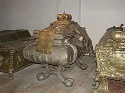 The silver urn with the removed heart and the copper urn with the entrails were taken to St. Stephen's Cathedral in Vienna on the same day and placed in the Ducal Crypt. In the evening at 11:00 p.m. the body was consecrated again and led with a large entourage to the Capuchin Church. The coffin was blessed for the last time and opened in the presence of the Oberhofmeister and the Oberkammerer to show the body. Six capuchin priests then brought the coffin into the Imperial Crypt.[4]