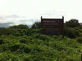 The Archie Carr National Wildlife Refuge is part of the United States National Wildlife Refuge (NWR) System, located along a twenty-mile (30 km) section of coastline from Melbourne Beach to Wabasso Beach, Florida, along State Road A1A. The 900 acre (3.6 km2) refuge was established in 1991, to protect the loggerhead and green sea turtles.