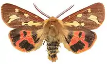 Arctia testudinaria, or Patton's tiger, is a moth of the family Erebidae. It was described by Geoffroy in 1785. It is found from northern Spain to southern and central France and southern Switzerland to north-eastern and southern Italy. It has also been recorded from Great Britain.[1] The habitat consists of grasslands, slopes, forest edges, clear dry forests, cliffs and mountain slopes, maquis, garrigues and dry meadows.[2]