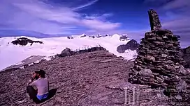 ![]() Arctomys Peak summit cairn, the Lyells in back | |