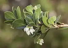 Arctostaphylos pacifica is a short burl forming species of manzanita that grows in mats on the sandstone outcrops of San Bruno Mountain at elevations of 300m. Specimens grow to 10–60 cm in height,[4] the bark of the plant is an unusual light brown color compared to the red hue of other Manzanitas, the serrate leaves are pastel green and densely fill the branches.[3] The plant uses ligno-tubers for clonal reproduction, which allowed for the species to survive the 1964 Devil's Arroyo fire that burned San Bruno Mountain, enabling plants to resprout from the reproductive burls.[5]