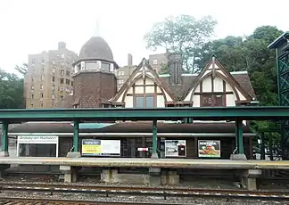 The station was originally part of the Ardsley Casino Clubhouse, a country club created through the support of some of the most notable and successful men in the US including Jay Gould, Cornelius Vanderbilt (New York Central entrepreneur) and John Pierpont Morgan. The Casino was built overlooking the Hudson River and besides the station, had a private dock to accommodate the yachts of members. The Ardsley Racquet and Swim Club, an offshoot established in 1927, inherited the property in 1935, and the casino was closed in 1936.[3] The site was replaced by the Hudson House Apartments. Even with all the changes, the original mid-1890s New York Central Railroad depot remained intact. As with many stations along the Hudson Division, the New York Central merged with the Pennsylvania Railroad in 1968 to form Penn Central Railroad. The 1970 bankruptcy of Penn Central forced it to turn service over to the MTA, which continued through the time it was taken over by Conrail in 1976, and then by Metro-North Railroad in 1983. While there is no official station house, Metro-North does maintain a small two-story brick depot, housing the northbound waiting room, ticket machines, and the United States Post Office for ZIP Code 10503.
