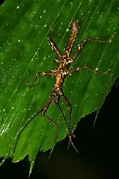 Josef Redtenbacher described the species in 1906 as Obrimus muscosus.[2] James Abram Garfield Rehn and his son John William Holman Rehn transferred them in 1939 together with Obrimus asperrimus also described by Redtenbacher to the genus Aretaon, which was specially established for these two species.[4] As syntypes are diverse, 47 to 64 millimetres (1.9 to 2.5 in) long, male and female specimens deposited. Two female and one male syntypes are in the Natural History Museum Vienna and three nymph syntypes in the Zoological Museum of the Russian Academy of Sciences in St. Petersburg. As early as 1935 Klaus Günther considered that Aretaon muscosus could be more spiny representatives of Aretaon asperrimus. However, because of the pronounced spines of the smaller specimens, he considered this to be unlikely. Also Philip Edward Bragg, who had already made the experience that the spines in adult Aretaon asperrimus are significantly reduced, mentioned this possibility in 2001, holding a synonymization but for too hasty.[5] In 2004 Oliver Zompro also mentioned that Aretaeon muscosus is very likely a synonym of Aretaon asperrimus.[6] Daniel Otte and Paul D. Brock finally used Aretaon muscosus as a synonym in 2005.[7] Francis Seow-Choen revalidated the species in 2016 because its syntypes match perfectly with the specimens he found from the Gunung Mulu National Park.[1][3]