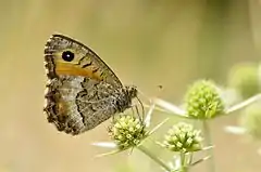 S. arethusa Esp. (43b, c). Above dark brown, with a yellow distal band, which is usually separated into spots in the male, and paler and broader in the female, the apical ocellus being without pupil and the fringes chequered grey and brown. The forewing is yellow beneath, the margin being marmorated with grey like the hindwing. which latter has a dark, in the male sinuous, median line, on the outside of which there is a pale band irrorated with white-grey. The distal band of the upperside varies enormously: it may be broad and continuous, or completely absent from the hindwing and vestigial on the forewing. — In ab. erythia Hbn., from South France and the East, the distal band is slightly dentate, the spots being acuminate: — in ab. dentata. which is the usual form at the Riviera, the spots are evenly and more strongly acuminate, the band therefore resembling a saw. — In boabdil Rbr. (43c) the band, above, is so shaded with smoke colour as to resemble the ground and almost to disappear in the same, only the apical ocellus with very feeble vestiges of the band being more distinct; Spain. — As obscura (43c) Ribbe sent me specimens from Andalusia which are quite black above and very vividly marmorated beneath. — Larva bone-colour, with a red-yellow dorsal-stripe in which there is a thin dark line, a yellow side-stripe and feeble, hardly visible, longitudinal hues; till June on Festuca. The butterflies from July till September, the various forms in some places flying together, being separated in other districts, common on lime-stone mountains, in the whole of South Europe, from Portugal to Turkey and South Russia, everywhere at the Black Sea, eastwards to Saisan in the Altai (Rueckbeil). In Europe the species extends northwards as far as Alsatia, Baden, Hungary (ab. peszerensis) and Galizia. The flight-places are often very distant from one another, being sterile hills and fallow-fields, especially on lime-stone.[6]