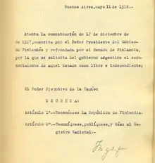 The first Finnish immigrants arrived to Argentina in 1906 and founded Colonia Finlandes in the vicinity of the town of Oberá, Misiones Province.[1] In May 1918, Finland regained its Independence from Russia after the Finnish Civil War. Argentina recognized the independence of Finland on 11 May 1918, becoming the first nation outside of Europe to do so. Soon afterwards, both nations established diplomatic relations and Finland opened a consulate in Buenos Aires.[2] In 1923, Argentina accredited an ambassador to Finland from its embassy in Warsaw, Poland while Finland accredited an ambassador to Argentina from its embassy in Madrid, Spain. In 1929, Finland opened a resident embassy in Buenos Aires, becoming its first embassy in Latin America.[2]