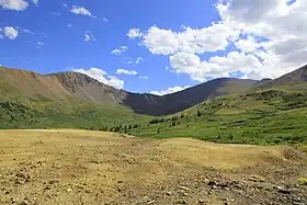 On September 14, 1864, former provisional territorial governor Robert Steele, along with James Huff and Robert Layton, discovered silver high on the slopes of McClellan Mountain, 1.85 mi (2.97 km) north of what we now call Argentine Pass.[4] The mountains of this region are predominantly granite and gneiss, with veins containing silver-rich galena and blende (sphalerite), as well as iron pyrite, cupriferous pyrite (chalcopyrite), and some tetrahedrite.[5] This was the first major discovery of silver ore in Colorado. They named the deposit the Belmont Lode (from the French for "beautiful mountain"), and the surrounding area came to be known as the Argentine mining district (from argentum, Latin for silver). The discovery led to the growth of Georgetown as an early center of the silver mining industry in Colorado, although development was slowed by a general ignorance of how to properly treat the ore, by the high cost of transportation from the mines, and by the climate at that altitude. Eventually, both sides of the pass were heavily mined, and the district was divided into the East Argentine and West Argentine Districts, joined by the pass.[6][7] Many remains of mining activity remain visible today.